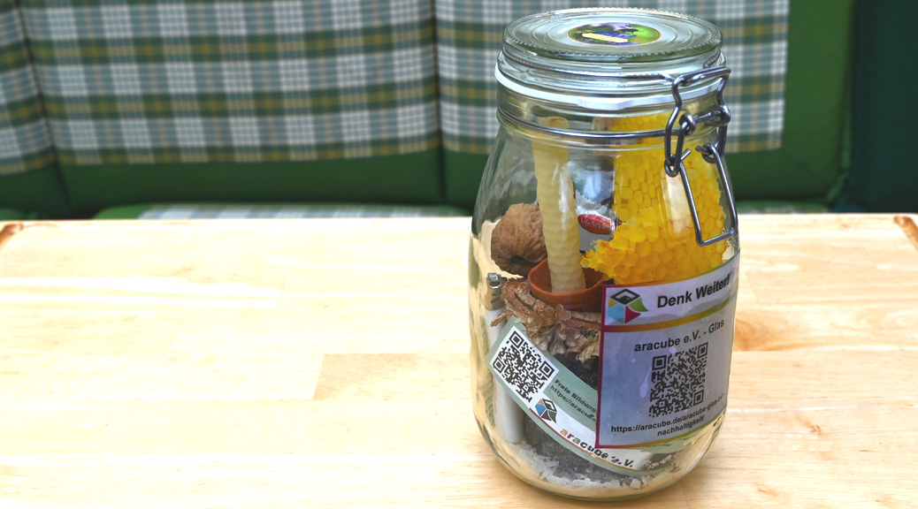 Die zweite Inspiration des Projektvorschlags kommt vom „Denk Weiter!“ Nachhaltigkeits-Glas eines Chemnitzer Vereins für freie Bildung und freie Software, dem  „aracube e.V.“: